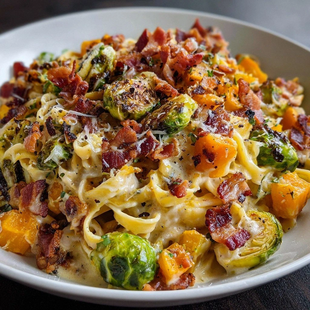Picture this: a rainy Saturday afternoon, the kitchen lights dim, and the only thing that can break the monotony is a sizzling pan. I was staring at a pile of Brussels sprouts and a block of beef bacon that had been sitting in the fridge since last week, and I thought, “Why not turn these into a creamy, savory masterpiece?” The idea was simple yet daring—combine smoky bacon, caramelized sprouts, sweet butternut squash, and a velvety cream sauce that clings to every strand of fettuccine. That moment was the spark that ignited the recipe you’re about to read. I dare you to taste this and not go back for seconds.