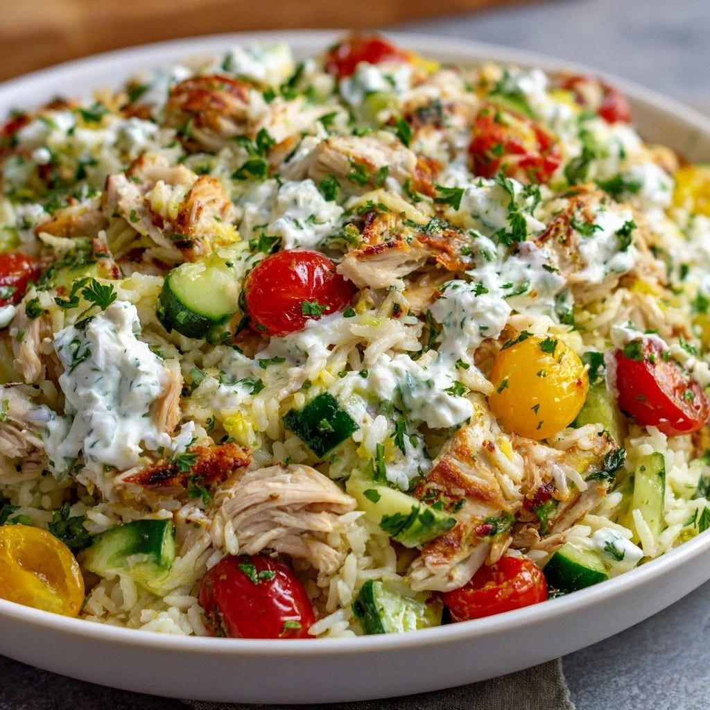The shredded chicken, whether rotisserie or leftover, provides a hearty, protein‑rich foundation that keeps the casserole satisfying. The rice, whether white, brown, or cauliflower, offers a neutral base that soaks up the tzatziki, creating a velvety texture that’s both comforting and filling. The diced cucumbers add a crisp bite that keeps the dish from becoming too mushy, while the halved cherry tomatoes contribute bursts of sweetness that contrast the savory notes. The feta cheese, crumbled on top, melts into golden pockets that caramelize slightly, offering a salty, nutty finish that’s impossible to resist. If you’re craving a low‑carb option, swap the rice for cauliflower rice; it will still absorb the sauce and maintain the dish’s integrity.
